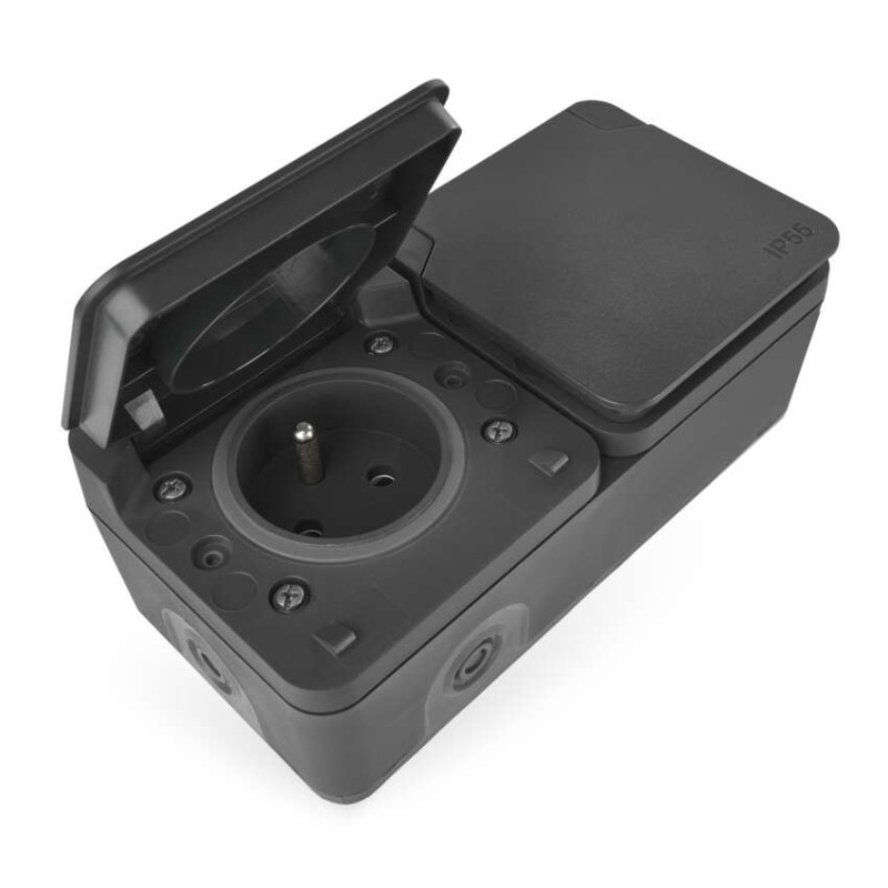 produkt zásuvka dvojnásobná s ochrannými kolíky a dětskými clonkami, barva šedá, způsob montáže na stěnu, krytí IP55