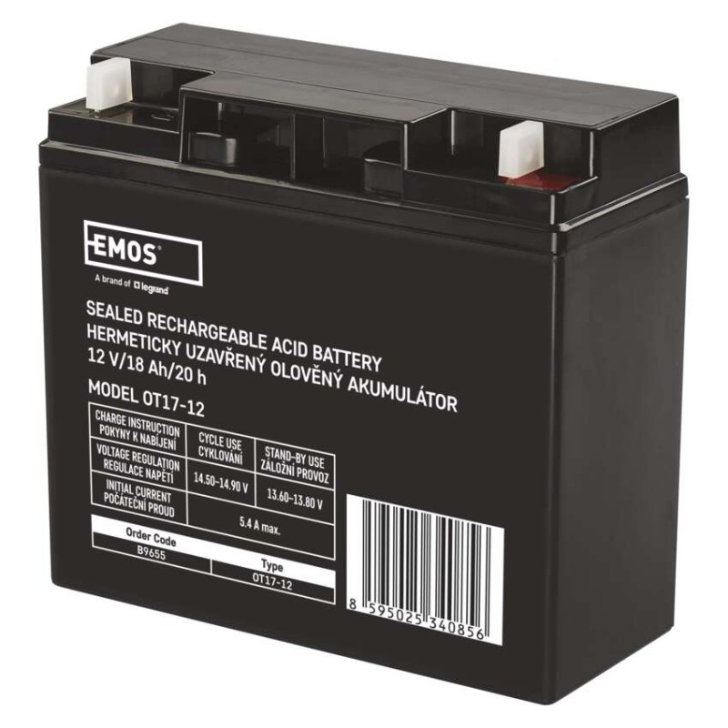 Popis produktuAkumulátor EMOS je vhodný jako náhradní baterie pro záložní zdroje UPS, RBC kity, elektronické systémy EZS, EPS, záložní systémy výtahů apod. Bezúdržbový, ventilem řízený olověný akumulátor v provedení AGM umožňuje být používán v libovolné poloze. Optimální životnost v záložních systémech je 5 let.Nabíjení baterie musí být prováděno vhodným napájecím zdrojem nebo nabíječem, který má hodnotu nabíjecího napětí 14,4 V pro 12 V akumulátory a 7,2 V pro 6 V akumulátory. V případě, že nabíječ nebo napájecí zdroj nemá tyto parametry, tak dochází k neúplnému nabíjení a dochází k tomu, že akumulátor bude rychle spotřebován a v krajním případě zničen. V tomto případě nelze uznat reklamaci akumulátoru.