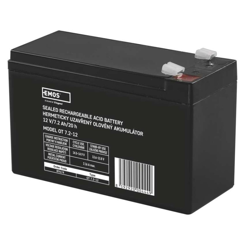 Popis produktuAkumulátor EMOS je vhodný jako náhradní baterie pro záložní zdroje UPS, RBC kity apod. Bezúdržbový, ventilem řízený olověný akumulátor v provedení AGM umožňuje být používán v libovolné poloze. Optimální životnost v záložních systémech je 5 let.Nabíjení baterie musí být prováděno vhodným napájecím zdrojem nebo nabíječem, který má hodnotu nabíjecího napětí 14,4 V pro 12 V akumulátory a 7,2 V pro 6 V akumulátory. V případě, že nabíječ nebo napájecí zdroj nemá tyto parametry, tak dochází k neúplnému nabíjení a dochází k tomu, že akumulátor bude rychle spotřebován a v krajním případě zničen. V tomto případě nelze uznat reklamaci akumulátoru.