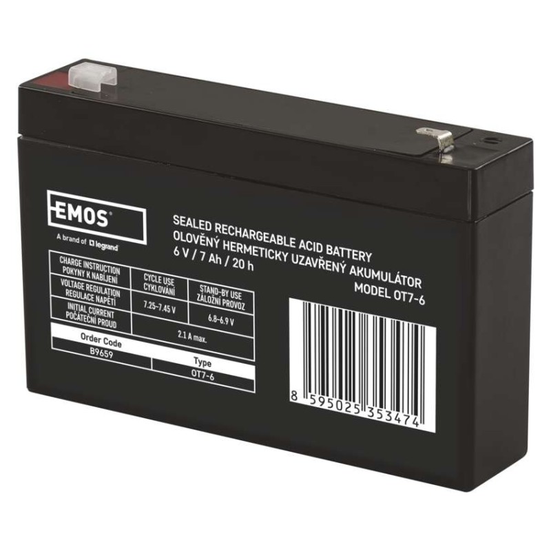 Popis produktuAkumulátor EMOS je vhodný jako náhradní baterie pro záložní zdroje UPS, RBC kity, elektronické systémy – EZS, EPS apod. Bezúdržbový, ventilem řízený olověný akumulátor v provedení AGM umožňuje být používán v libovolné poloze. Optimální životnost v záložních systémech je 5 let.Nabíjení baterie musí být prováděno vhodným napájecím zdrojem nebo nabíječem, který má hodnotu nabíjecího napětí 14,4 V pro 12 V akumulátory a 7,2 V pro 6 V akumulátory. V případě, že nabíječ nebo napájecí zdroj nemá tyto parametry, tak dochází k neúplnému nabíjení a dochází k tomu, že akumulátor bude rychle spotřebován a v krajním případě zničen. V tomto případě nelze uznat reklamaci akumulátoru.