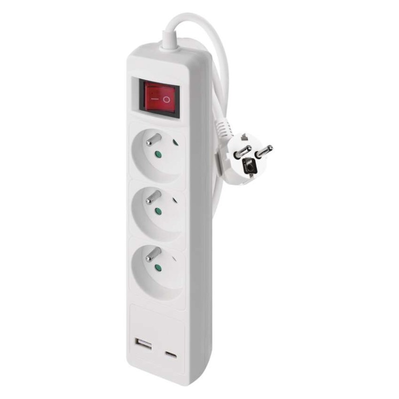 Popis produktuProdlužovací přívod s vypínačem. 250V~/16A max. 3 zásuvky s dětskými clonkami. USB A+C 3,4 A, 17 W max. Délka přívodního kabelu 2 m. Vodič H05VV-F3G 1,5mm2.Výhody produktuMax. zátěž 3 680 W.