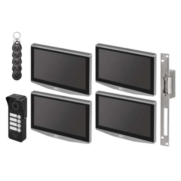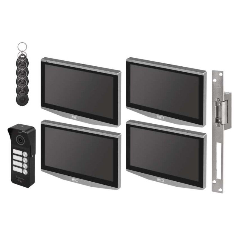 počet monitorů 4, počet kamerových jednotek 1, počet tlačítek kamerové jednotky 4, dveřní zámek součástí balení ano, zdroj pro zámek součástí balení ne