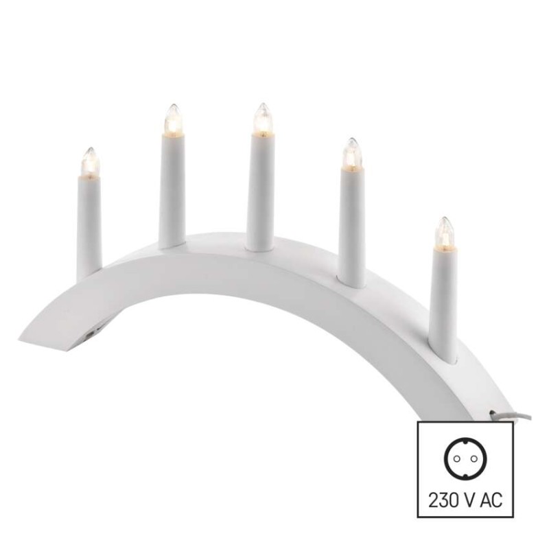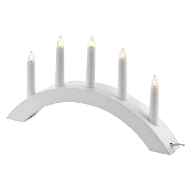 Svícen na 5x žárovičku E10 dřevěný bílý, oblouk, 20×38 cm, vnitřní, teplá bílá